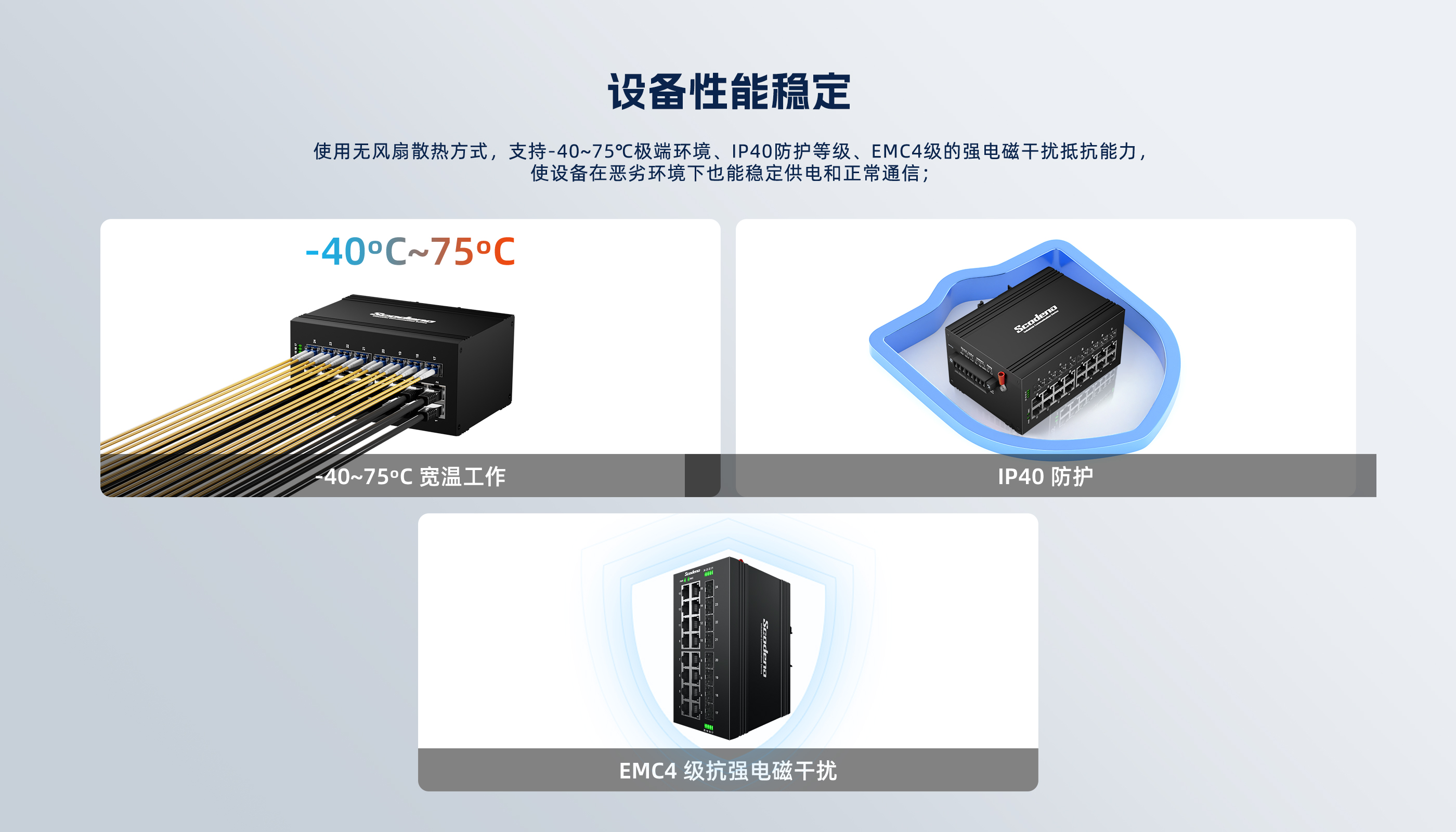 l-40℃~+75℃工作温度,IP40防护等级、宽温与高防护应对恶劣环境