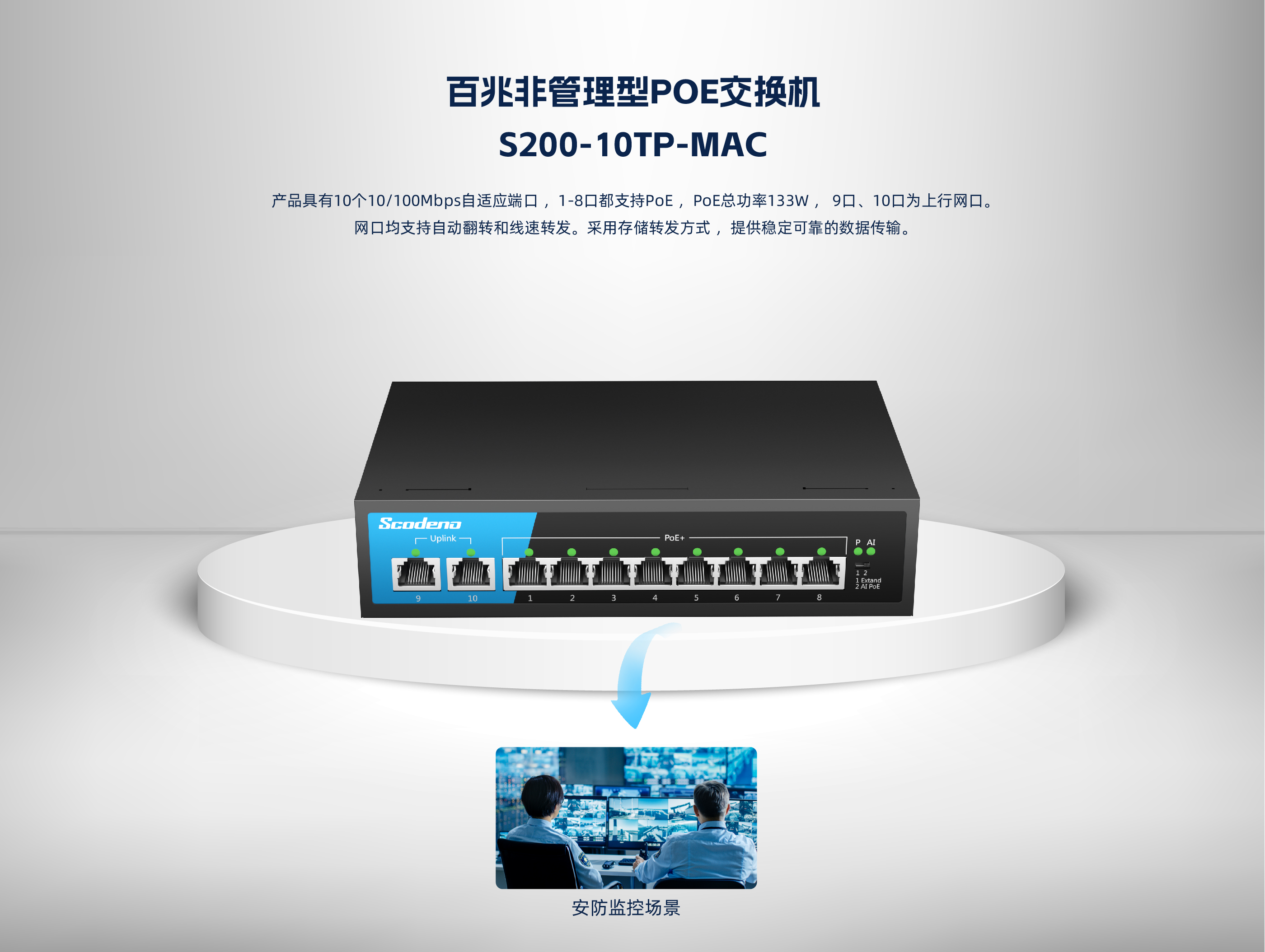 S200-10TP-MAC系列非管理型PoE交换机 ,具有10个10/100Mbps自适应端 口 , 1-8口都支持PoE , PoE总功率133W , 9口、 10口为上行网口。网口均支持自 动翻转和线速转发。采用存储转发方式 ,提供稳定可靠的数据传输。