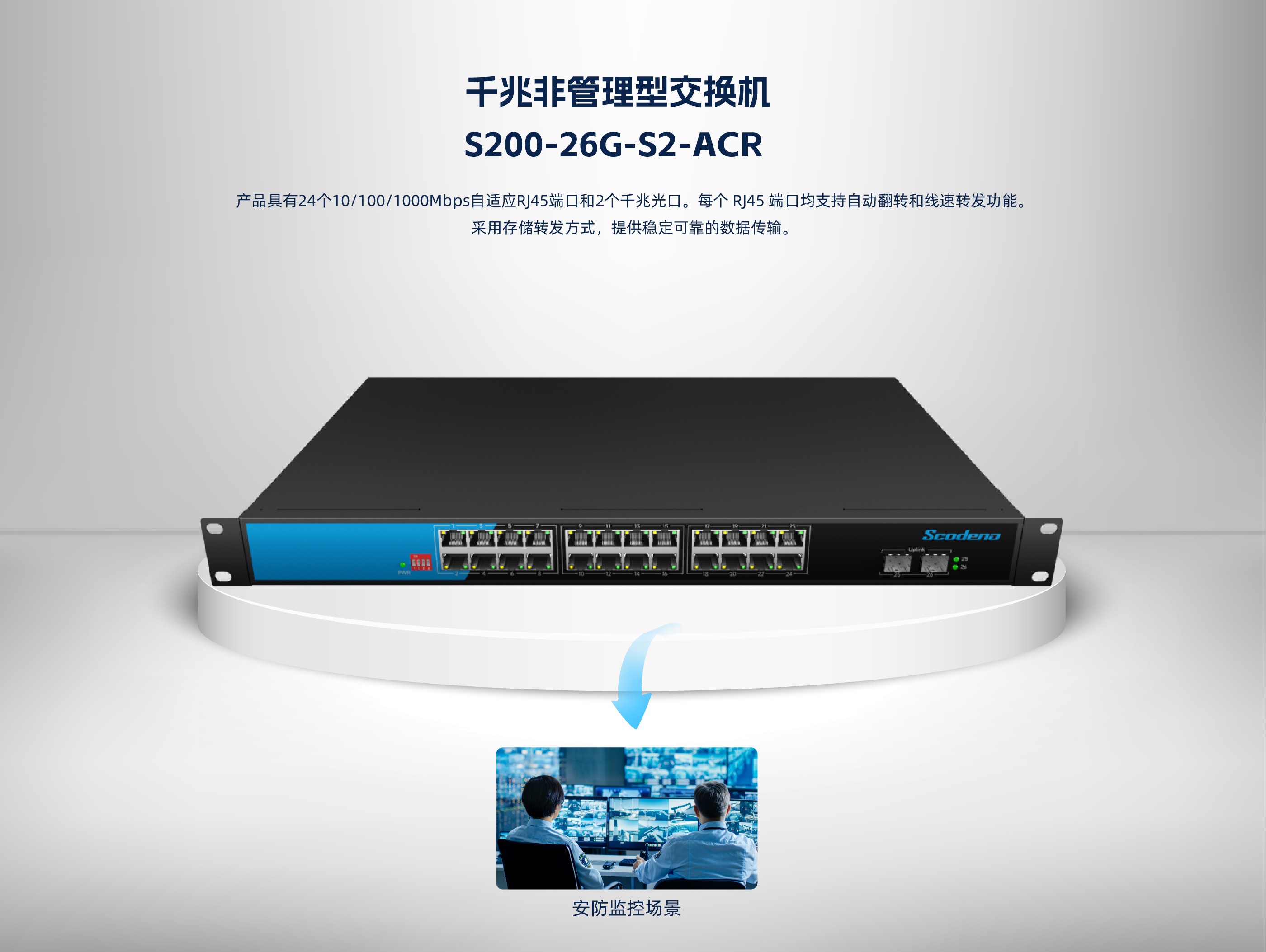 S200-26G-S2-ACR系列非管理型交换机 ,具有24个10/100/1000Mbps自适应 RJ45 端口和2个千兆光口。每个 RJ45 端口均支持自动翻转和线速转发功能。采用存储 转发方式 ,提供稳定可靠的数据传输。