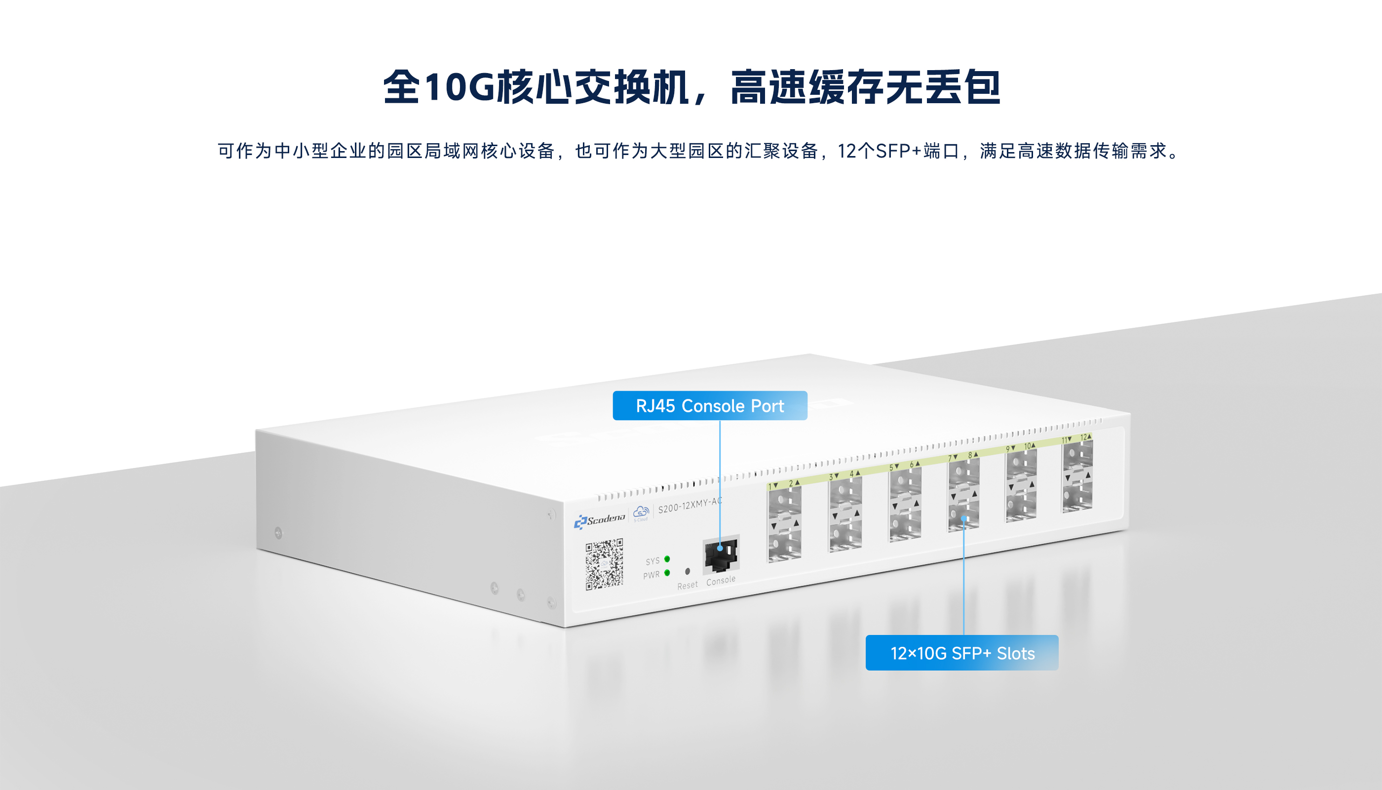 S200-12XMY-AC采用12*10G SFP+光端口,采用QoS集成的存储转发技术,确保所有端口带宽高效分配,保证数据传输稳定,系统提供CLI、web界面、云端管理等多种管理方式,操作直观,维护简便。